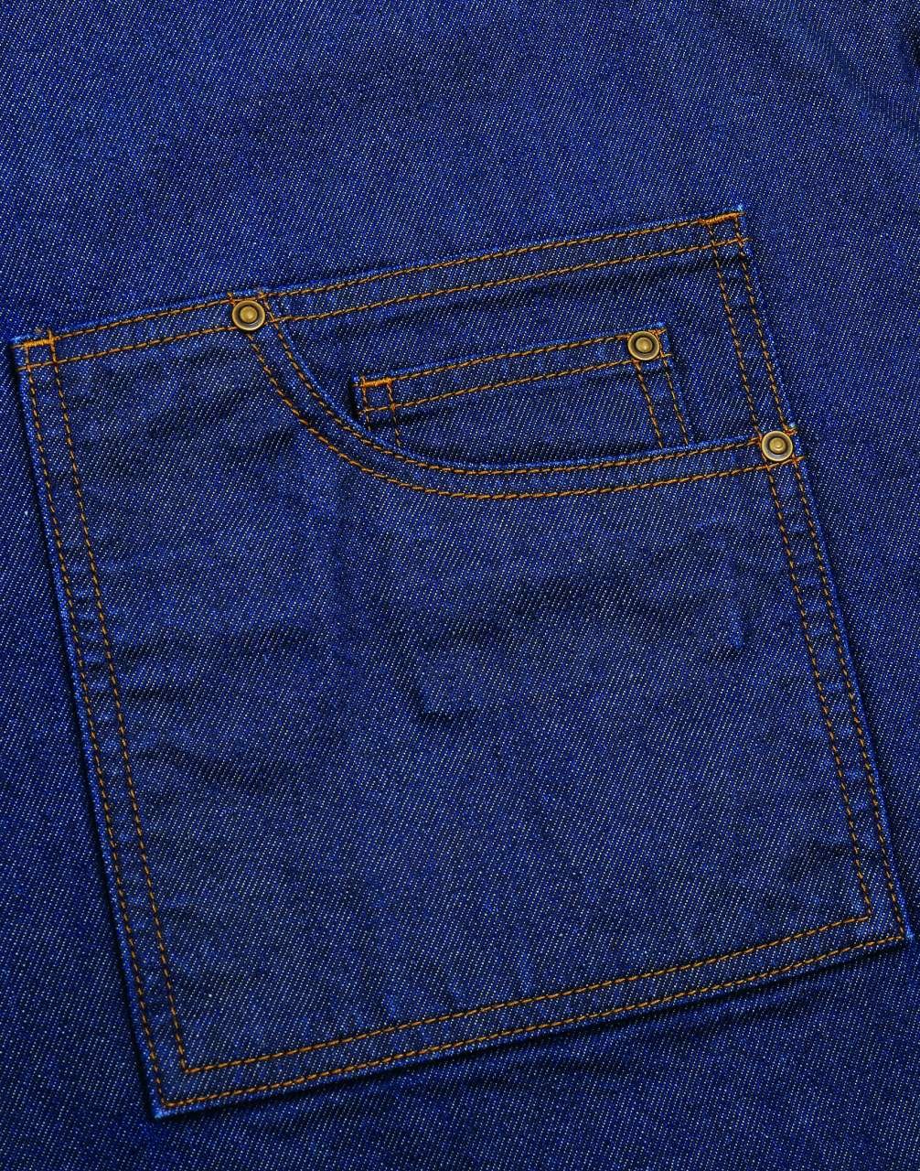 Dlouhá riflová zástěra unisex s odolným voskovým vzhledem a vodoodpudivým povrchem. Má efektní a praktickou nadrozměrnou kapsu 18 cm širokouu a 20 cm hloubokou s prošíváním a nýtovaným detailem.