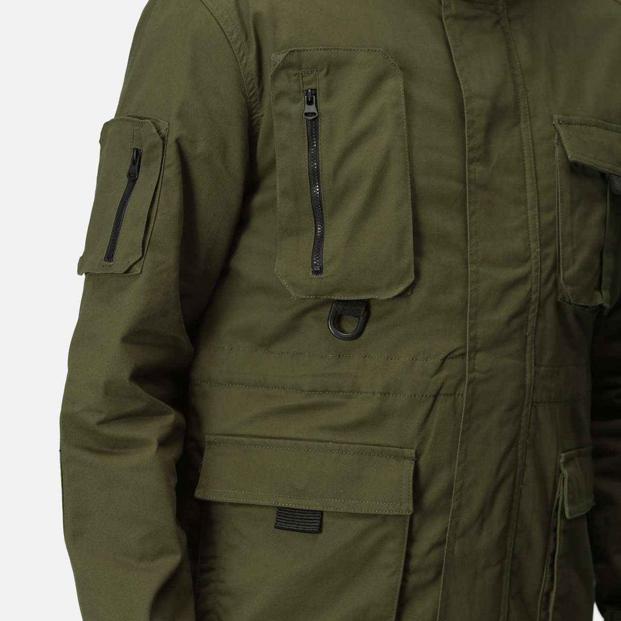 Funkční provedení zahrnuje skrytý přední zip, jednu zipovou kapsu na hrudi, tři prostorné cargo kapsy s patentkami, postranní kapsy na zahřátí rukou, zipovou kapsu na rukávu a D-ring pro připojení drobných nástrojů. Elbow patch (vrstvení látky na loktech) a nastavitelné manžety s patentky přispívají k odolnosti a praktičnosti. Zadní díl s průhybem zajišťuje větší volnost pohybu.