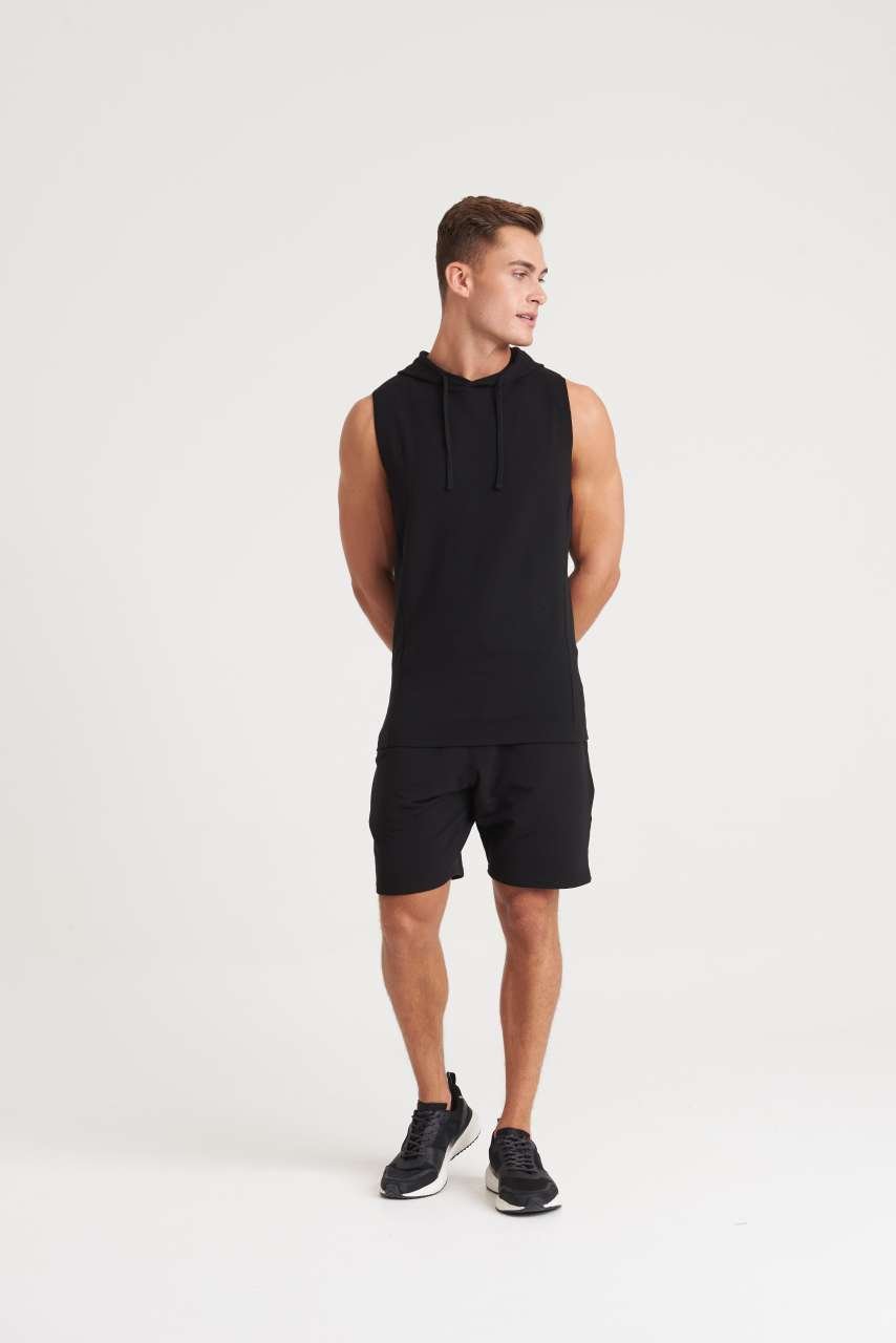 Pánská mikina bez rukávů je vhodná zejména na sport. Má kapuci se stahujícími šňůrkami a prodloužený střih. Mikina má boční švy.