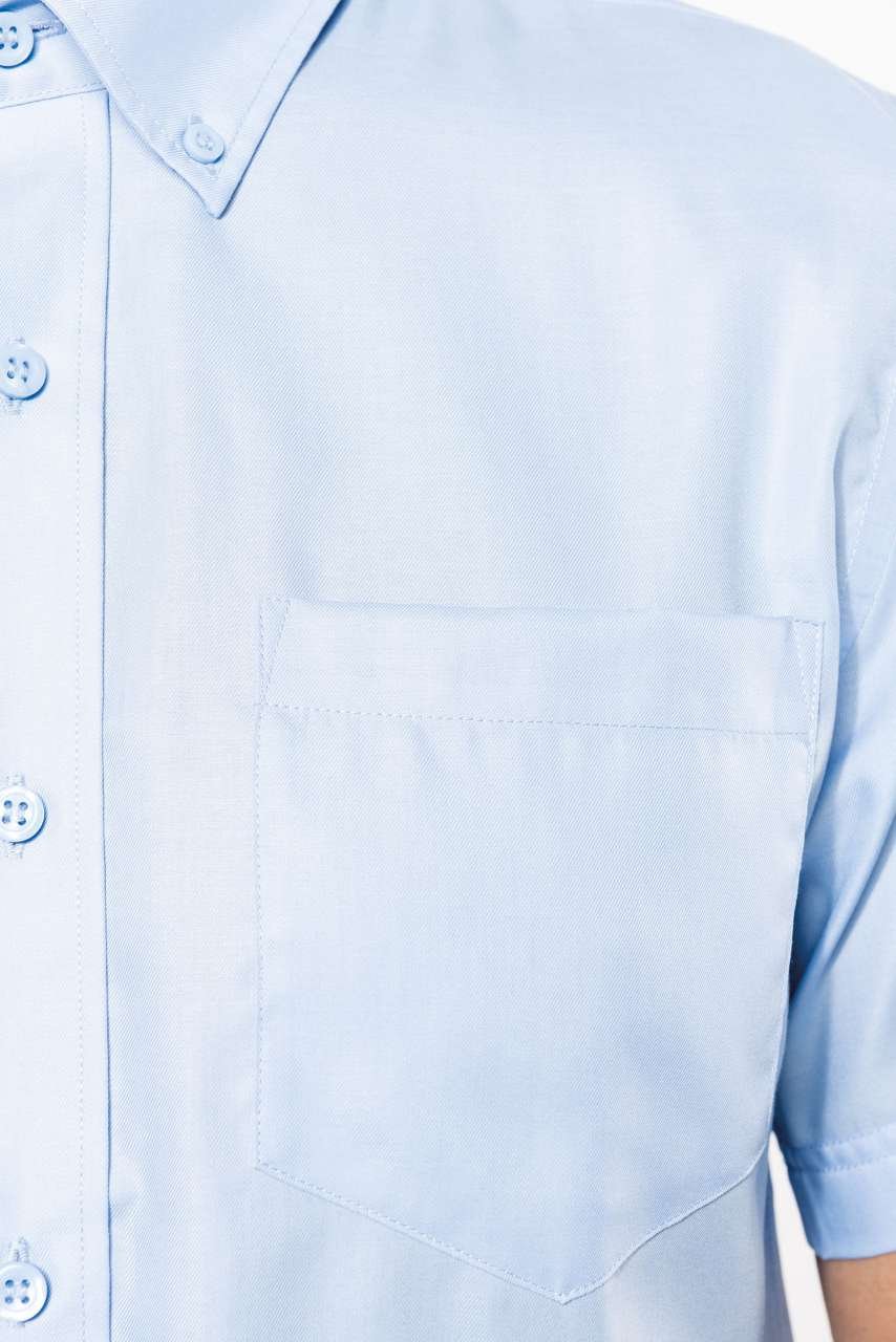 Pánská košile s krátkým rukávem vyrobena z 100 % mikro bavlněného kepru s non-iron úpravou, která minimalizuje potřebu žehlení a udržuje upravený vzhled i při častém nošení. Materiál s gramáží cca 115 g/m² zajišťuje komfort a lehkost vhodnou pro letní sezonu. Model je vybaven límcem s knoflíky, barevně sladěnými knoflíky a levou náprsní kapsou pro praktické použití v pracovním či formálním prostředí. Zadní část s dvojitým sedlem a dvěma bočními záhyby zlepšuje padnutí, zatímco zapošité švy a tvarovaný spodní lem přispívají k čistému profesionálnímu vzhledu.