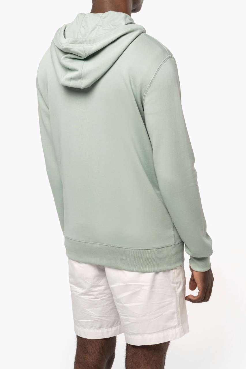 Unisex mikina na zip s kapucí je vhodná pro firemní kolekce, týmové oblečení i merchandising, kde se očekává jednotný vzhled a dlouhodobá tvarová stálost. Materiál z organické bavlny doplněné o recyklovaný post-consumer polyester je zpracovaný jako francouzské froté LST (low shrinkage terry) a je enzymově praný pro kultivovaný omak. Úzký střih doplňují 2 lemované přední kapsy, kovový zip a podšitá kapuce se sladěnou šňůrkou zakončenou kovovou špičkou. Pro čistý branding je důležité provedení bez značkového štítku u krku (pouze velikostní) a půlkruhová úprava v průkrčníku pro snazší dekorování z vnitřní strany. Certifikace STANDARD 100 by OEKO-TEX®