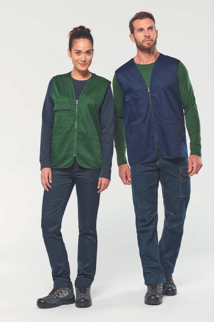 Lehká pracovní vesta z odolné směsové tkaniny se štíhlejším střihem. Dvě prostorné přední kapsy na suchý zip a náprsní kapsa s přihrádkou na pero, celopropínací zip a poutko v krku. Mírně prodloužený zadní díl a čisté lemování. Ideální pro branding i pracovní týmy. Rozšiřte svůj sortiment!