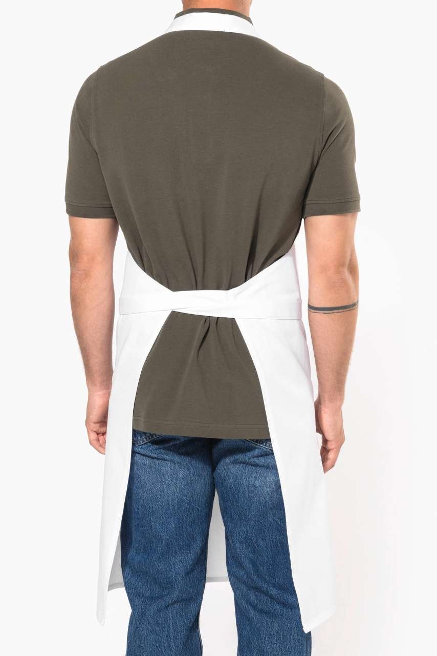 Bavlněná zástěra s velkou přední kapsou a dvěma přihrádkami. Délku lze nastavit pomocí posuvné kovové spony. Ideální jako pracovní zástěra díky možnosti praní až na 85°C v souladu s ISO 15797. Certifikace v souladu s STANDARD 100 od OEKO-TEX®N° CQ1007/8, IFTH.